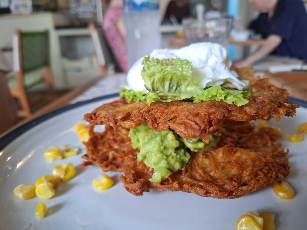 Grace went for the Hash Brown Avocado, which came topped with a perfectly poached egg—her absolute favorite. The dish was a beautiful play on textures: the crunch of the warm hash brown meeting the buttery softness of the avocado and the rich, creamy flow of the egg yolk.